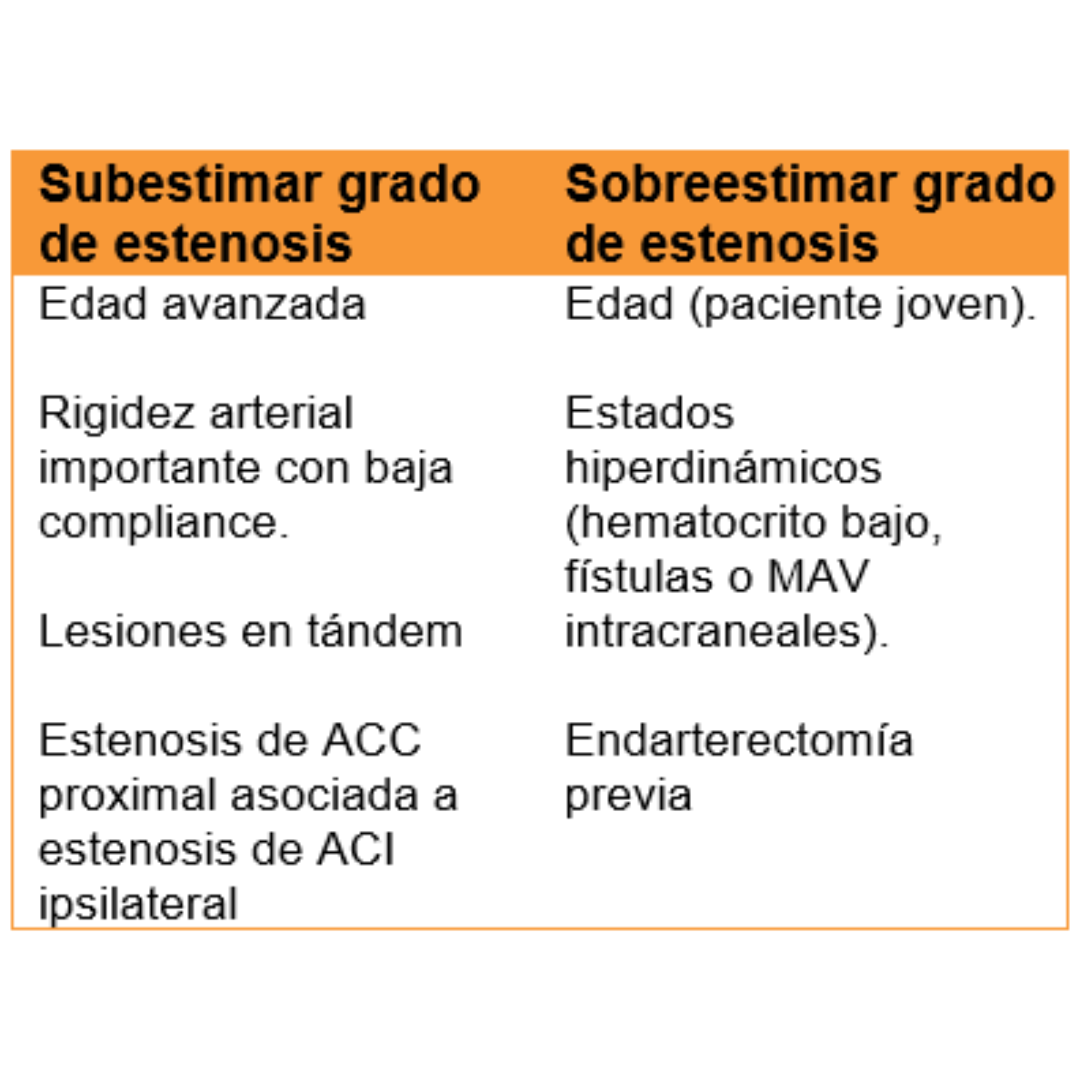 En sospecha de estenosis ≥ 50%, siempre se deben evaluar signos indirectos (segmento extracraneal post-estenótico de la ACI, la arteria oftálmica y las arterias intracraneales).