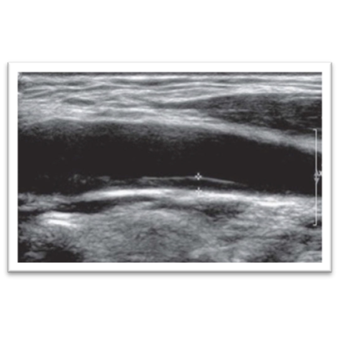 magen 2: Valoración del grosor intima-media de la arteria carótida común. Un grosor de 1 mm es considerado dentro de lo normal, mayor a 1,5 mm se considera placa de ateroma.