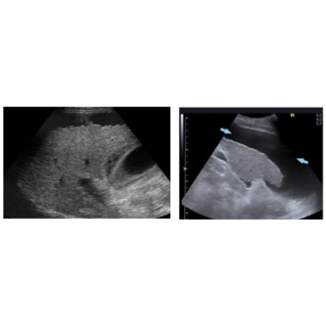 Dentro de los hallazgos ecográficos podemos encontrar perdida de los ángulos hepáticos y la redistribución de volumen donde podremos encontrar: